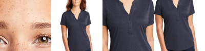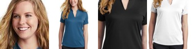 A contrast hex textured interior gives these styles a subtle exterior texture while Dri-FIT moisture management technology helps keep things from heating up. Design details include a self-fabric collar and open hem sleeves. Tailored for a feminine fit with a flattering V-neckline. The contrast heat transfer Swoosh design trademark is on the left sleeve. Made of 5-ounce, 100% polyester Dri-FIT fabric.