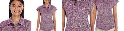 100% polyester; Moisture wicking; Snag resistant; Mechanical stretch; Bold, two-color heather pattern; Self-fabric collar; Elongated V-neckline; Tagless;